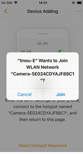 Chú ý: Nếu điện thoại của bạn không thể tự động kết nối với tín hiệu vì lý do nào đó, vui lòng chuyển đến trang kết nối Wi-Fi của điện thoại, kết nối điện thoại của bạn với tín hiệu Wi-Fi hiển thị trên trang ứng dụng, sau đó quay lại trang Imou Life. Mật khẩu Wi-Fi là mã an toàn trên nhãn thiết bị.