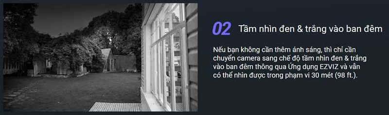 Tầm nhìn đen & trắng vào ban đêm: Nếu bạn không cần thêm ánh sáng, thì chỉ cần chuyển camera sang chế độ tầm nhìn đen & trắng vào ban đêm bằng cách sử dụng chế độ hồng ngoại. Hồng ngoại của Camera Ezviz C8W có tầm xa 30 mét.